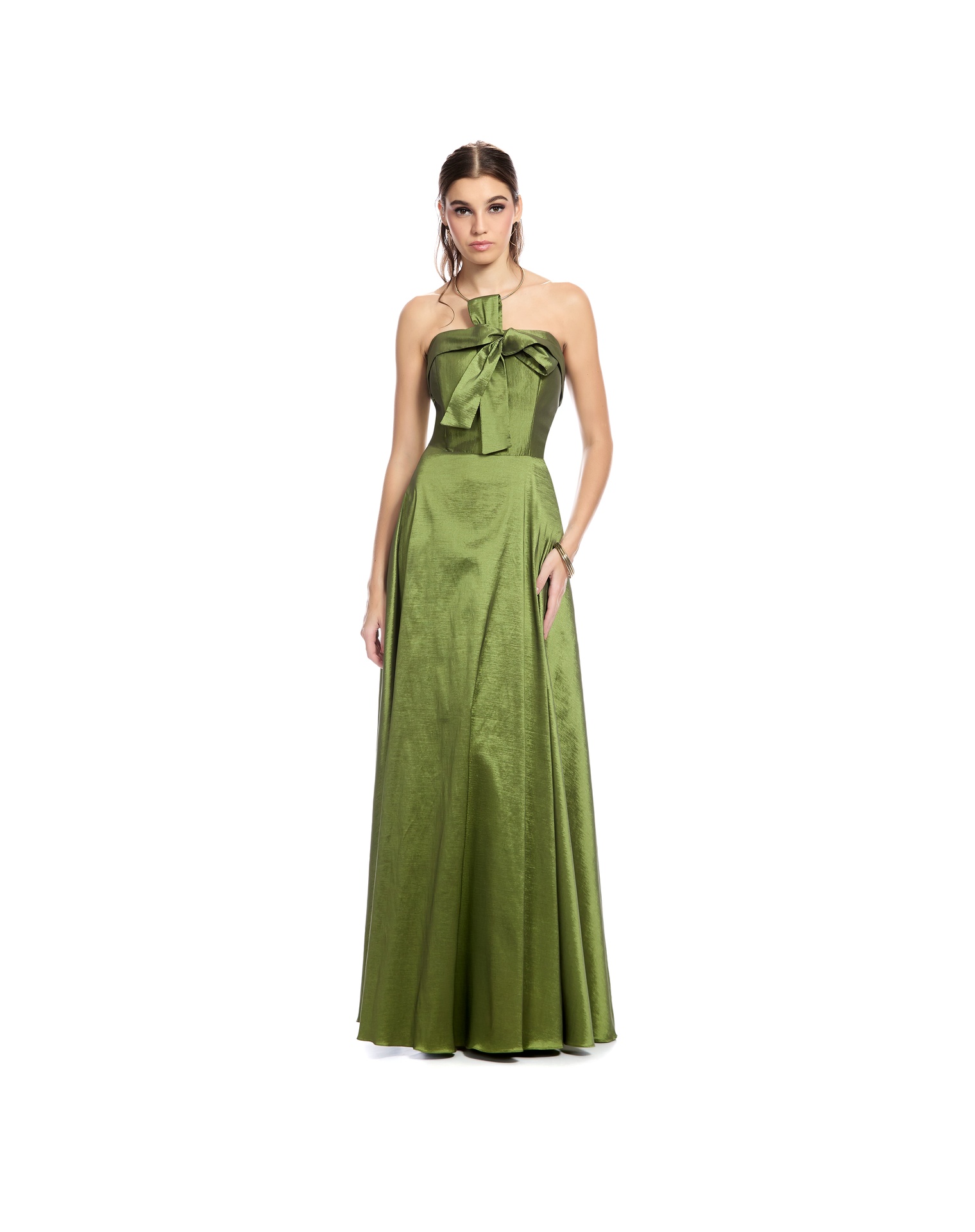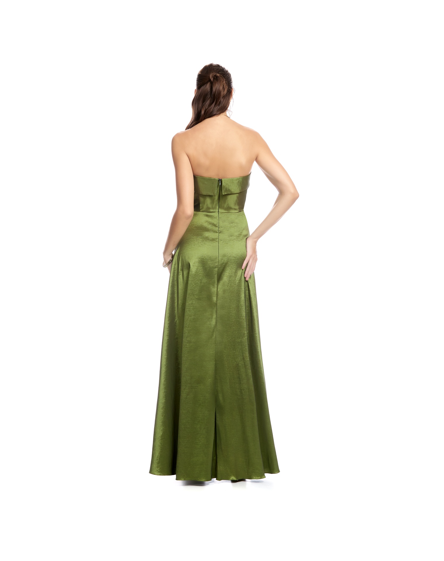 Vestido Largo Verde Strapless Con Moño En Escote Falda Semicircular