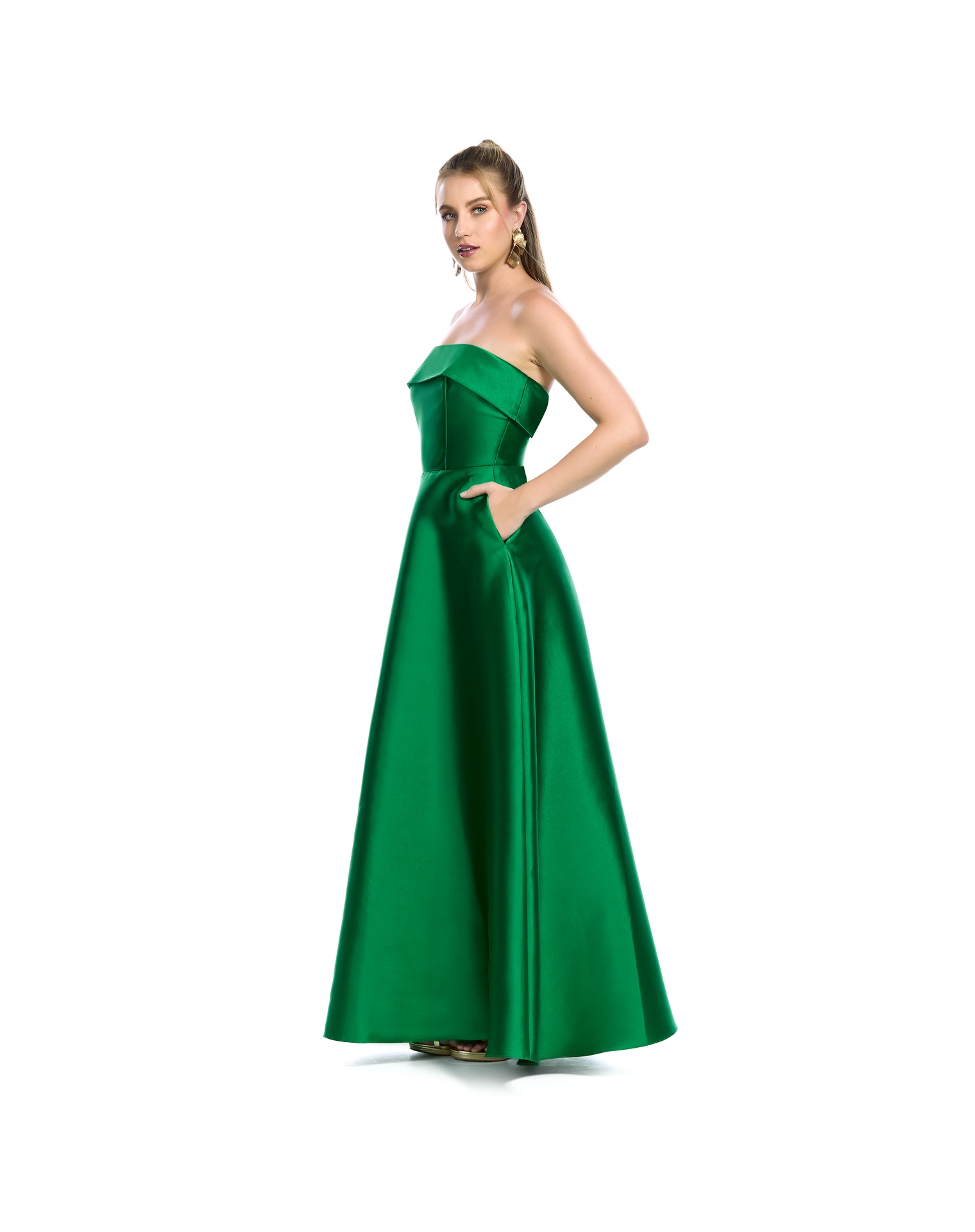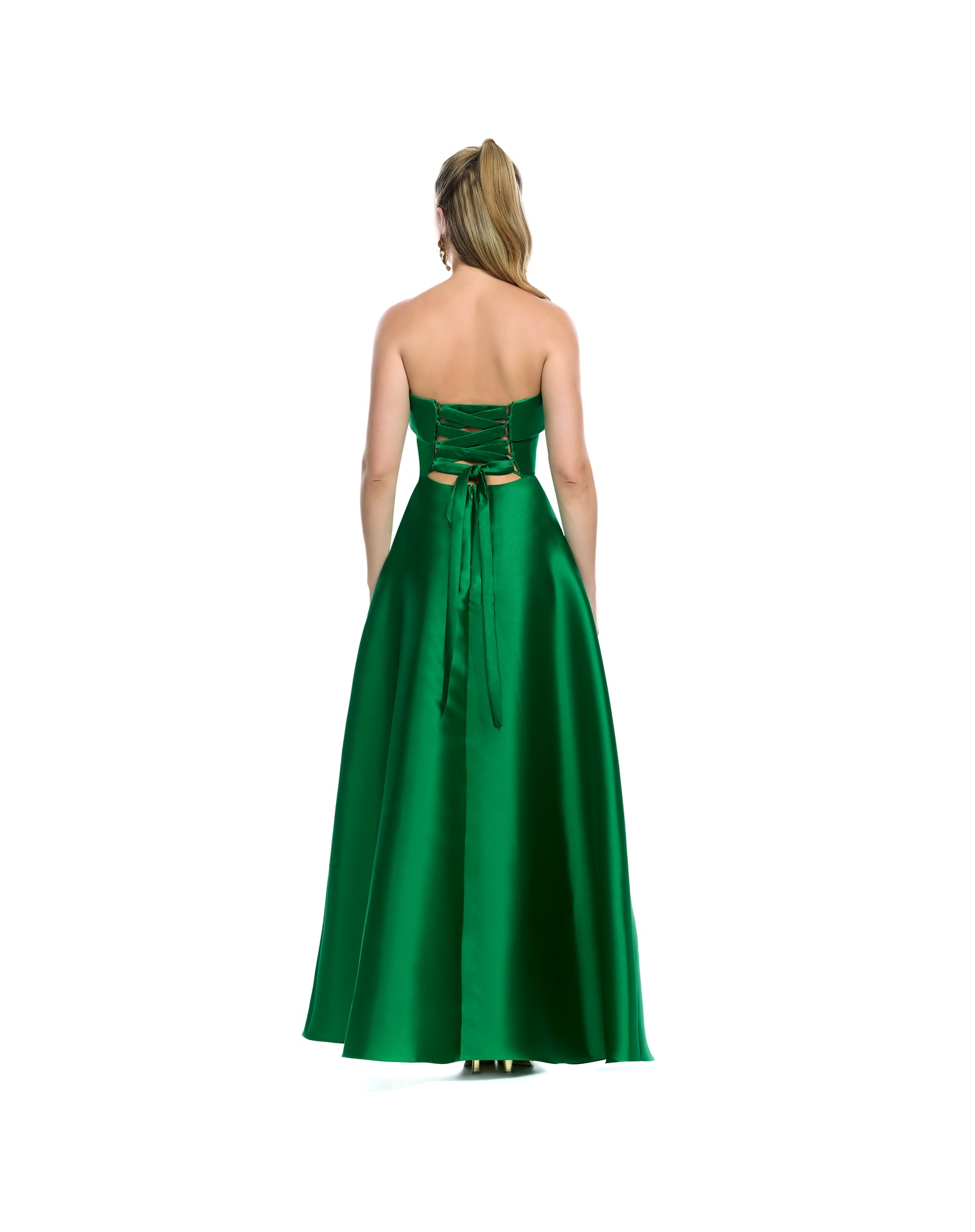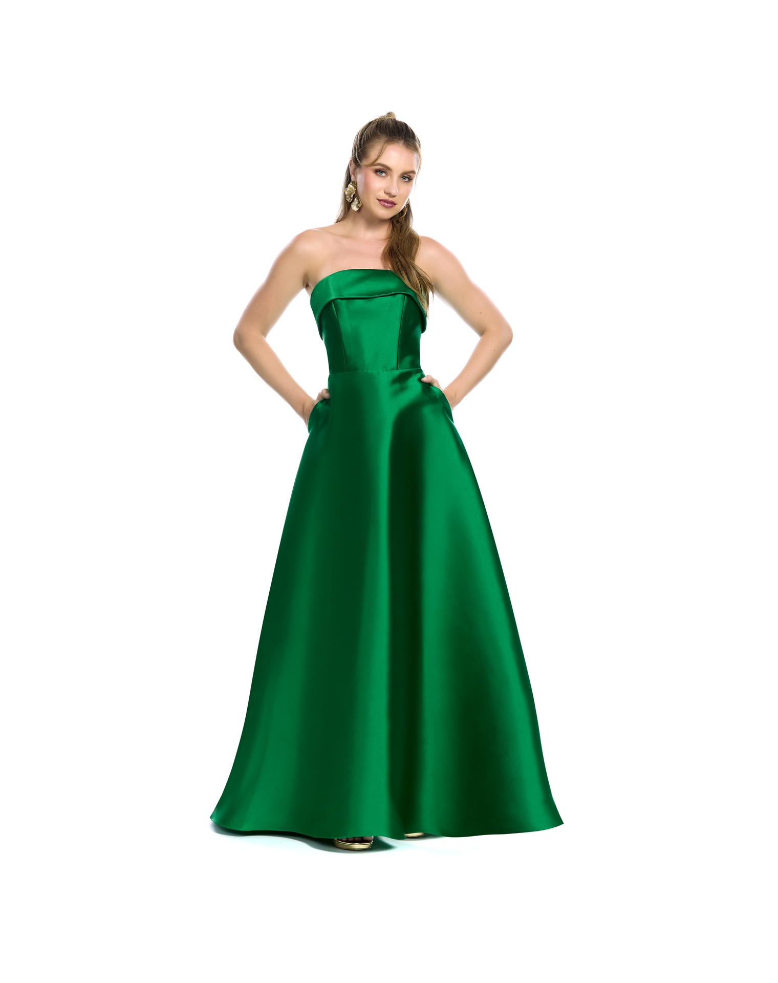 Vestido Largo Naranja Strapless Con Jaretas En Espalda Y Falda Amplia