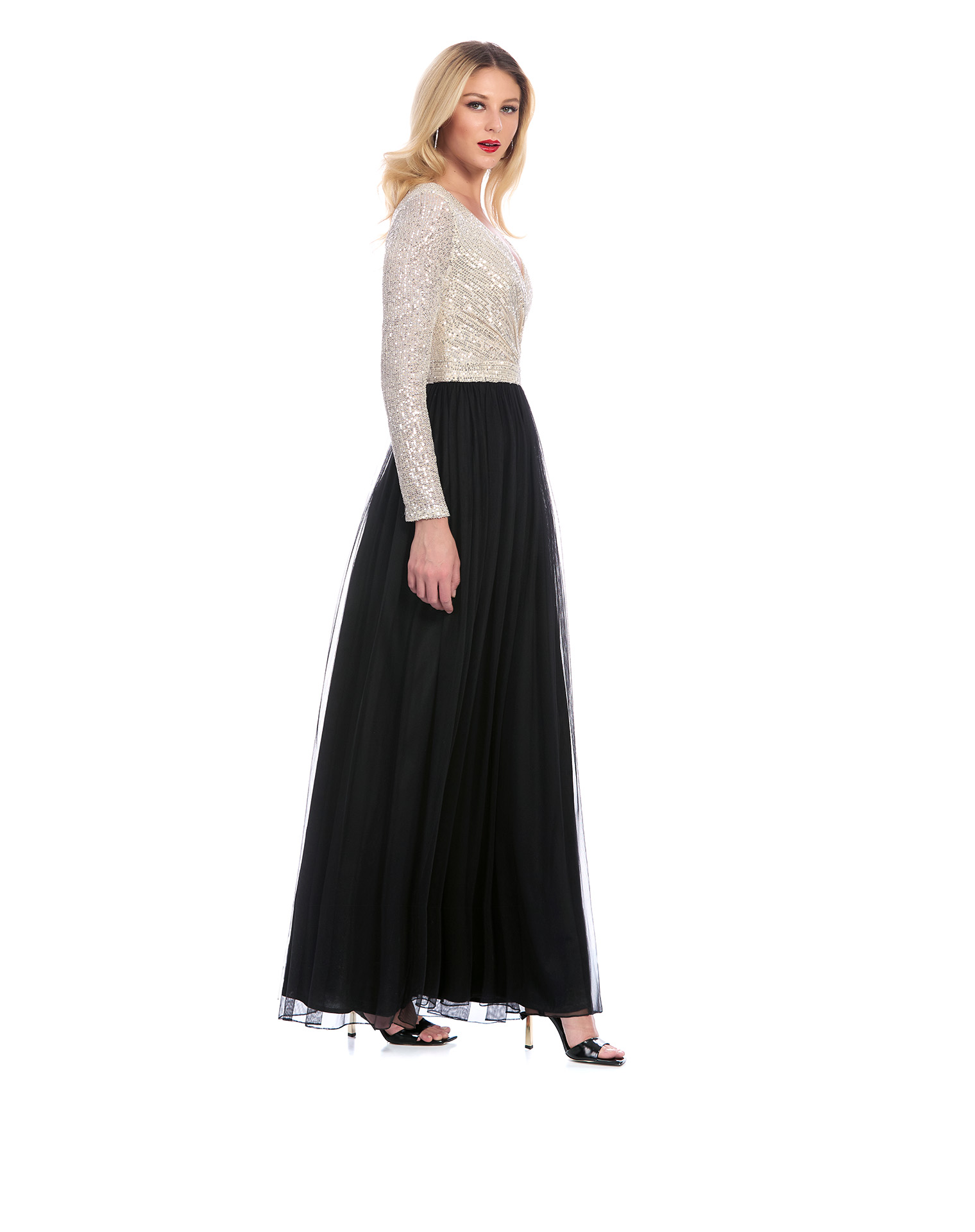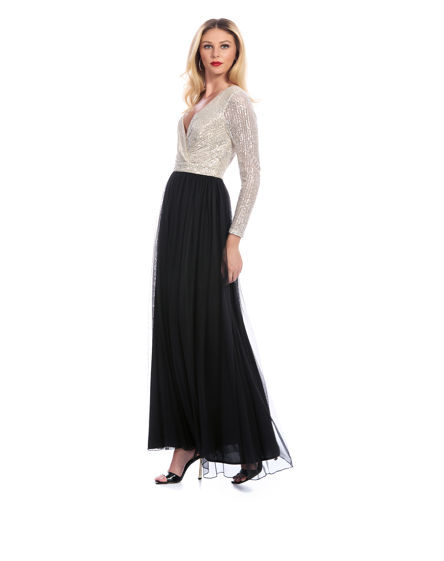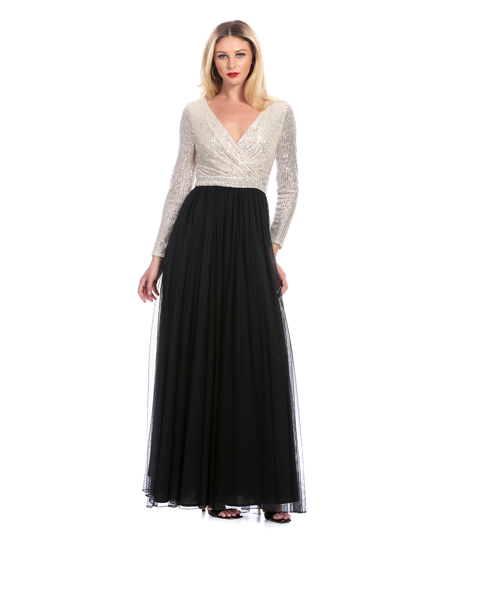 Vestido Largo Beige Escote V Manga Larga Falda Semicircular