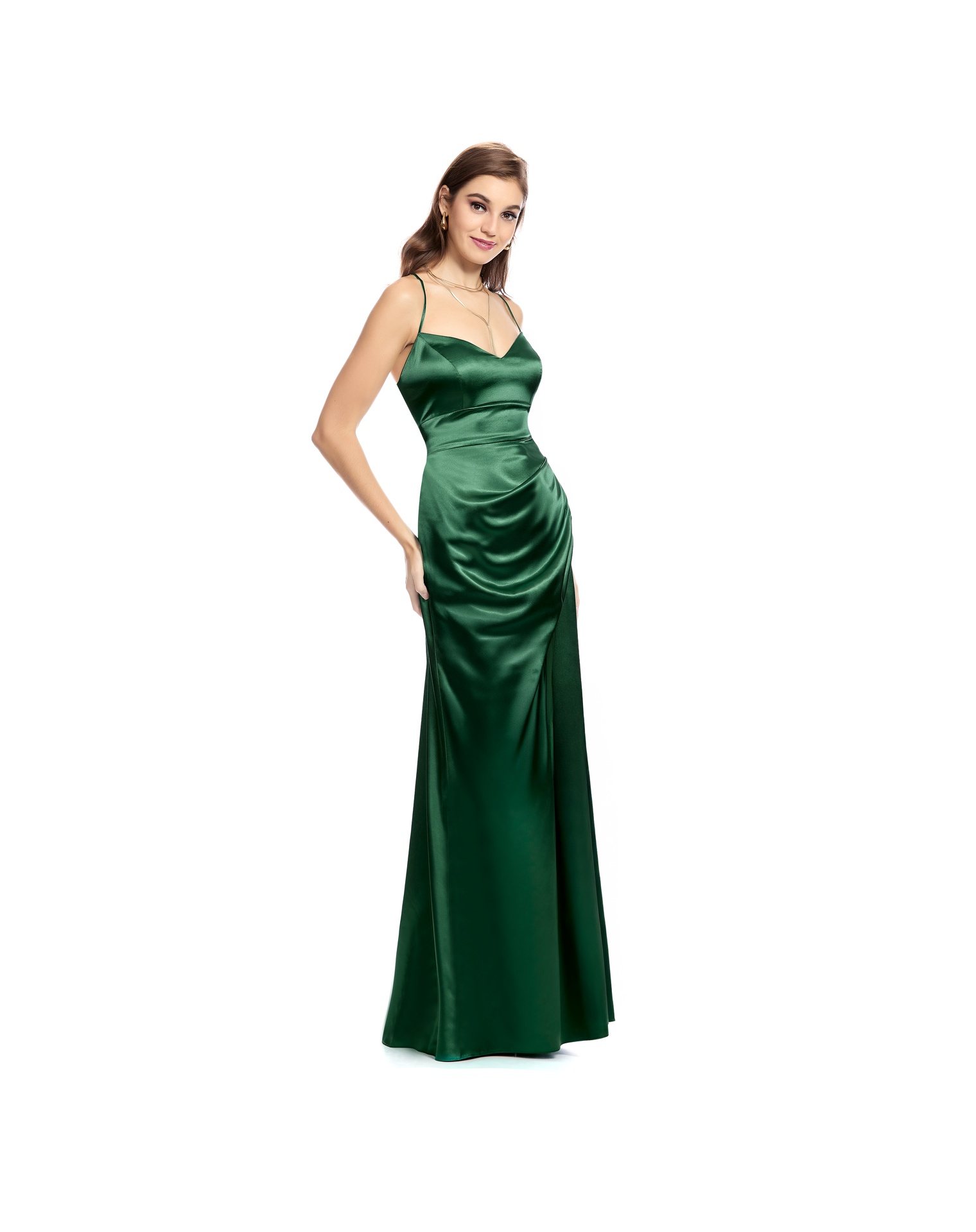 Vestido Largo Verde De Tirantes Escote V Con Drapeado Y Abertura En Falda Espalda Con Jaretas