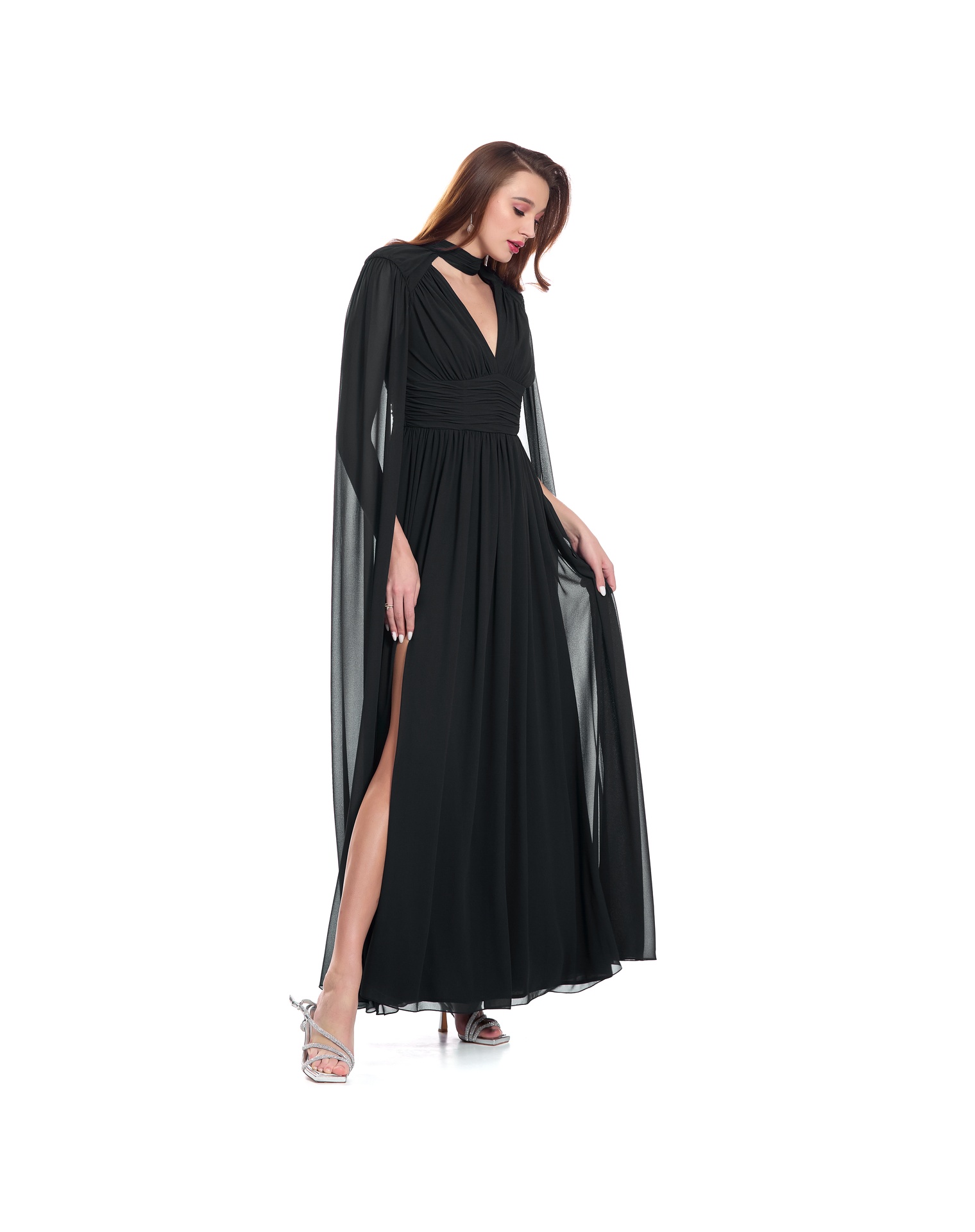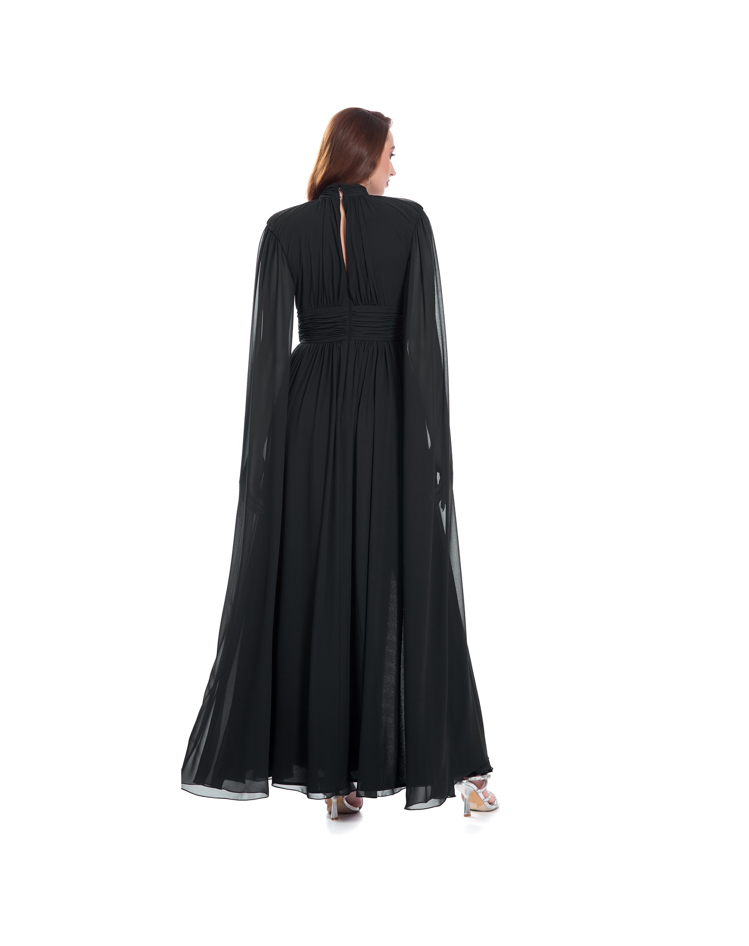 Vestido Largo Negro Escote En V Con Fajilla Drapeada Cuello Alto Con Hombreras Unidas Al Talle Con Manga Tipo Capa Falda Semi Circular Con Pliegue Ligero