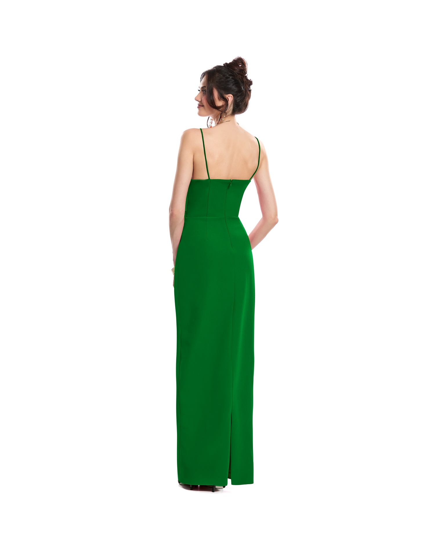 Vestido Largo Verde Strapless Con Tirantes Talle Drapeado Falda Con Abertura