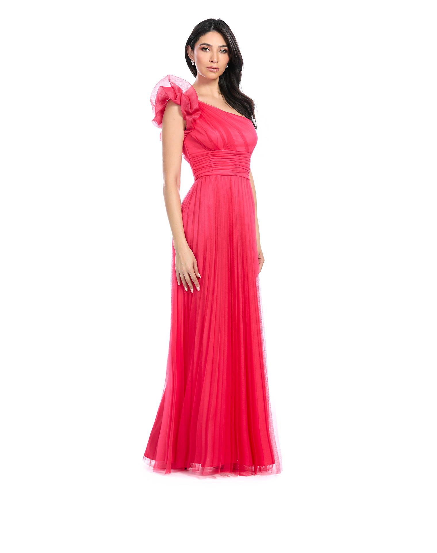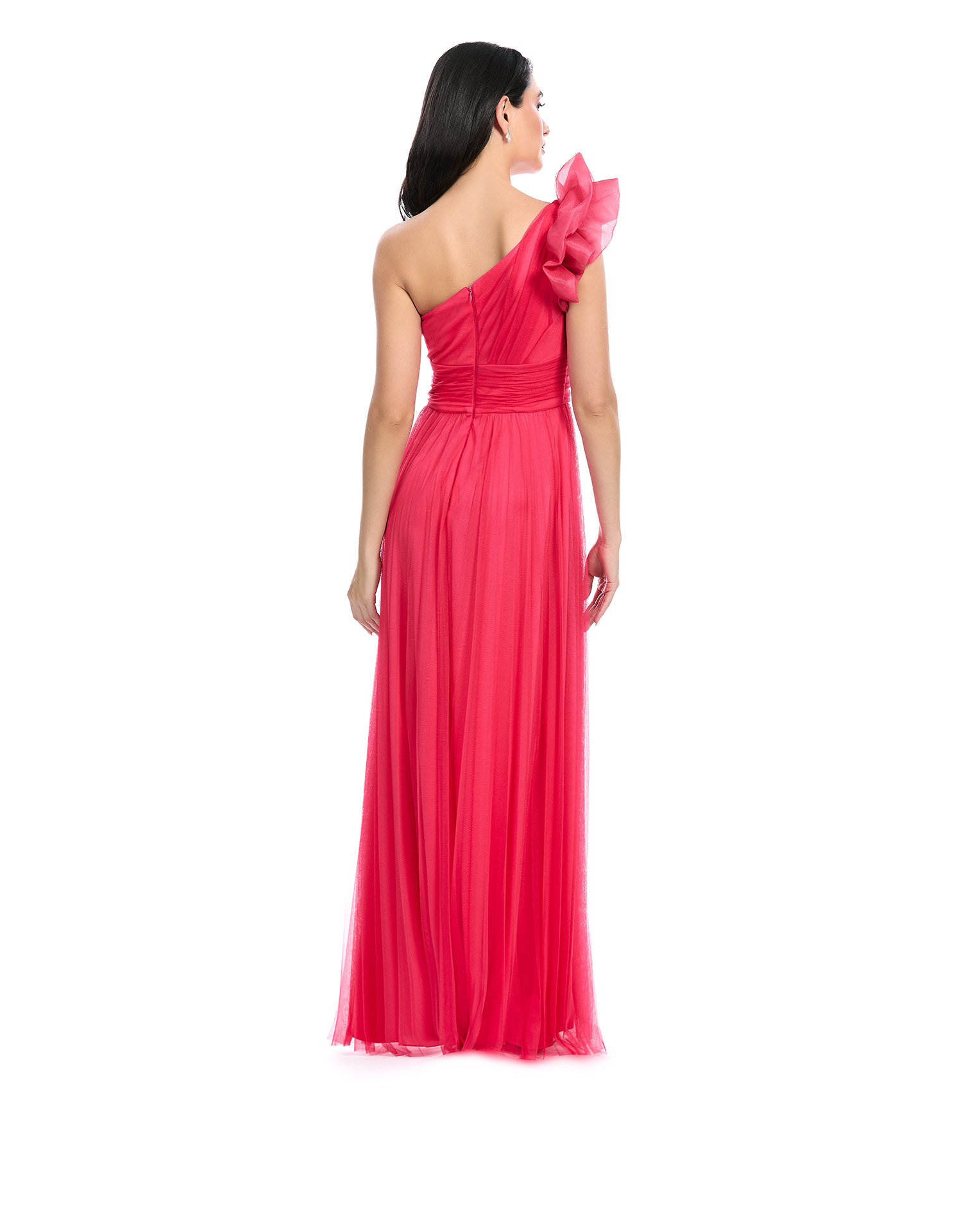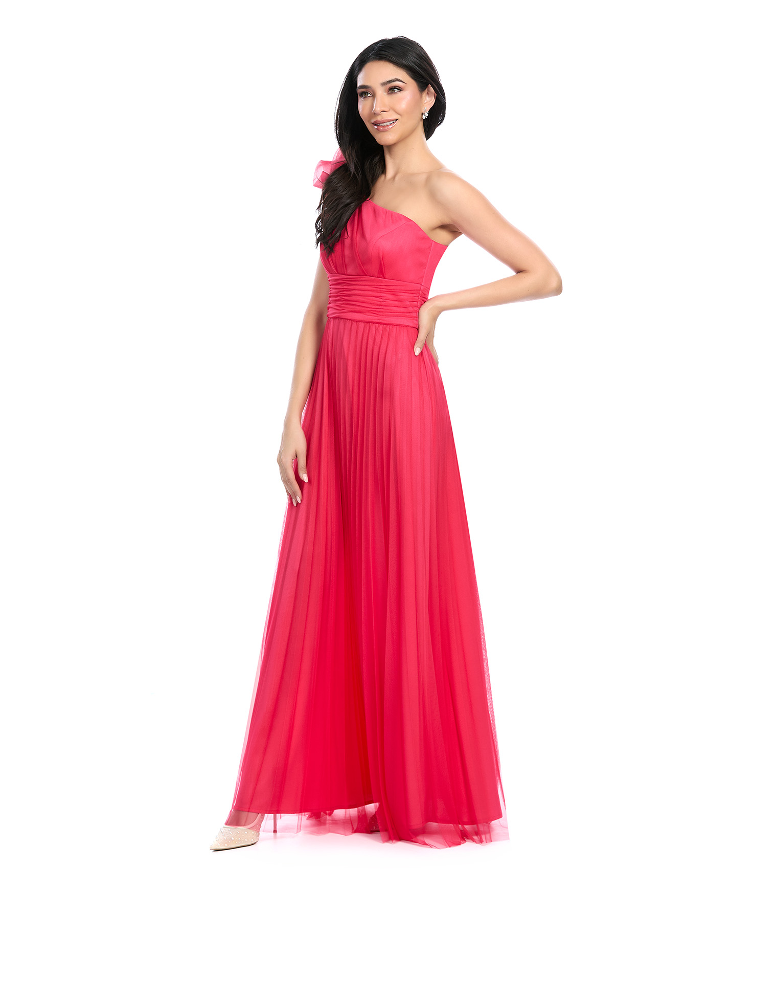 Vestido Largo Coral Asimétrico Con Drapeado En Talle Y Fajilla Falda Semicircular Con Pliegues