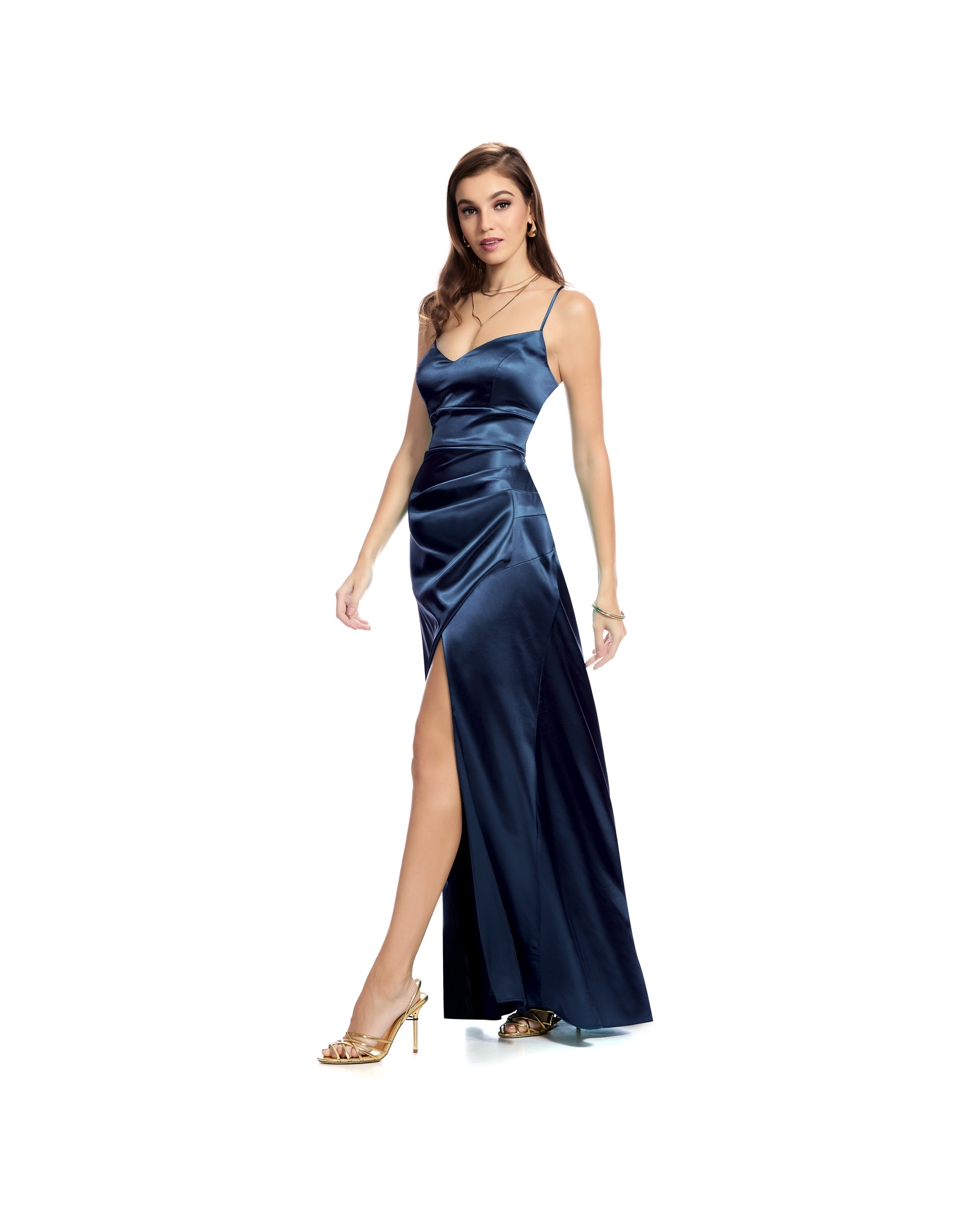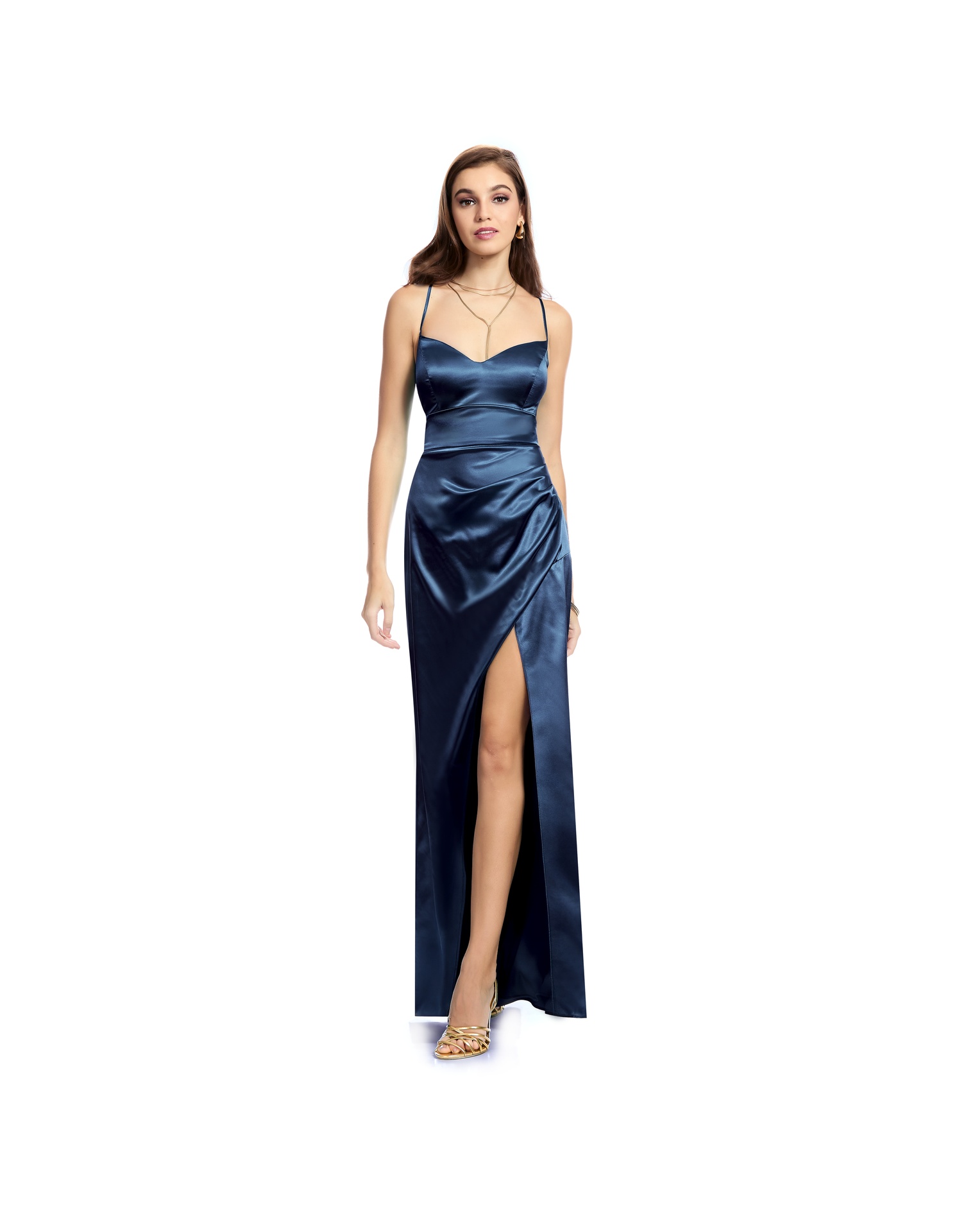 Vestido Largo Azul De Tirantes Escote V Con Drapeado Y Abertura En Falda Espalda Con Jaretas