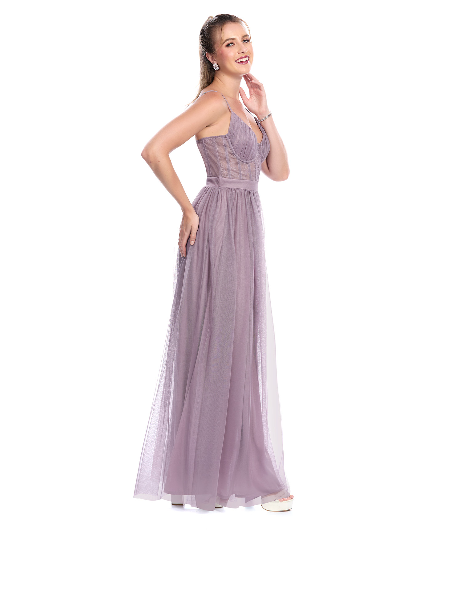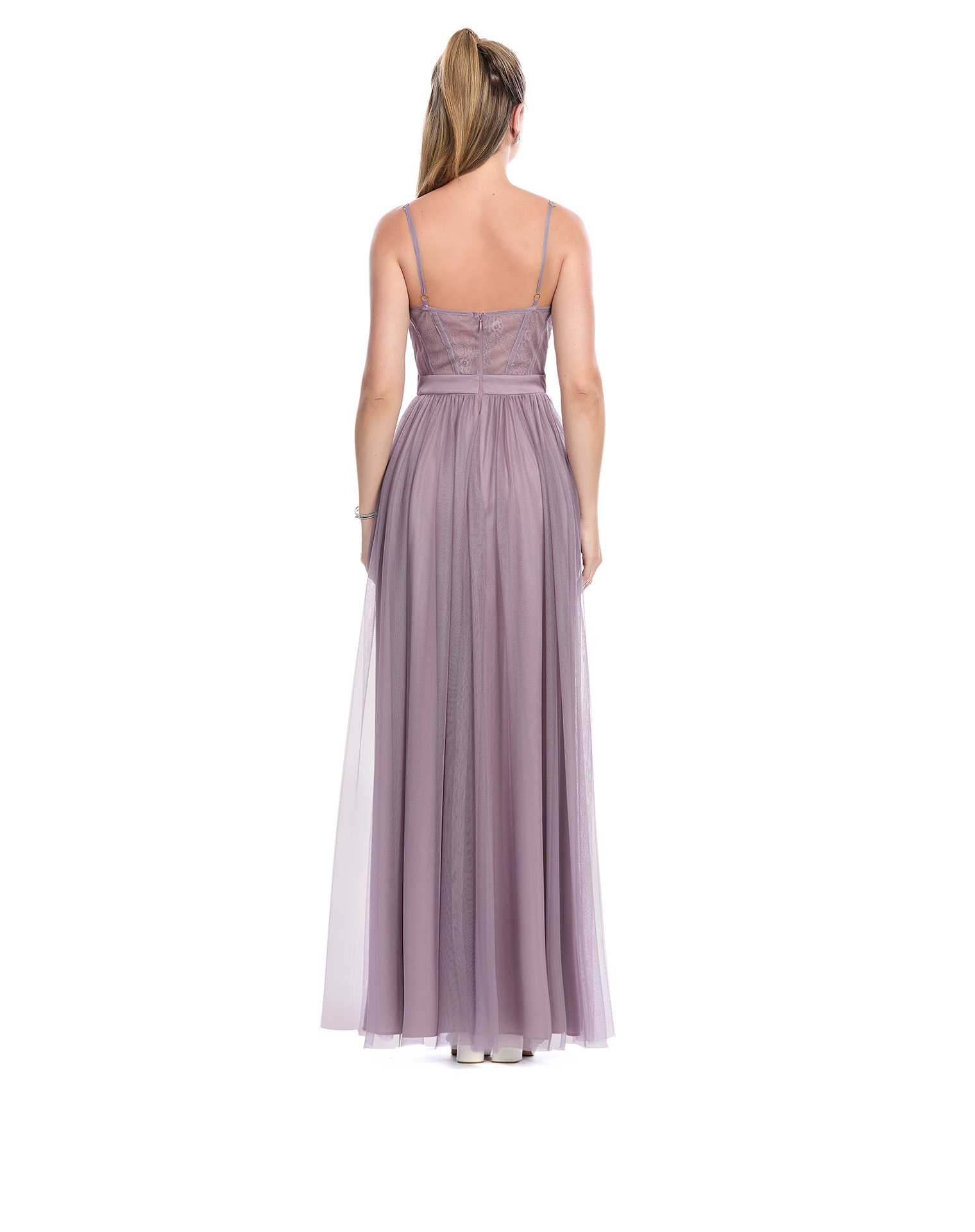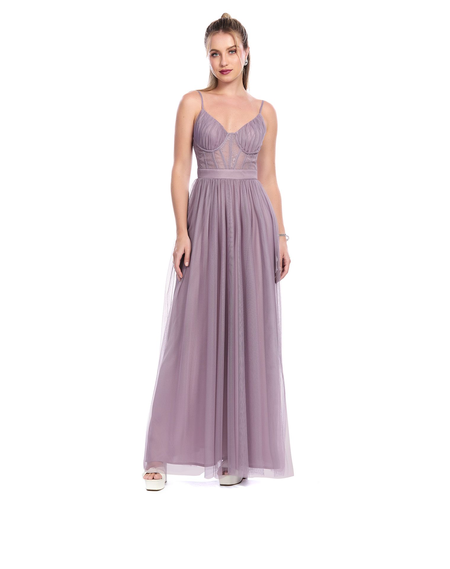 Vestido Largo Malva De Tirantes Escote V Talle Con Varillas Y Drapeado Falda Semicircular