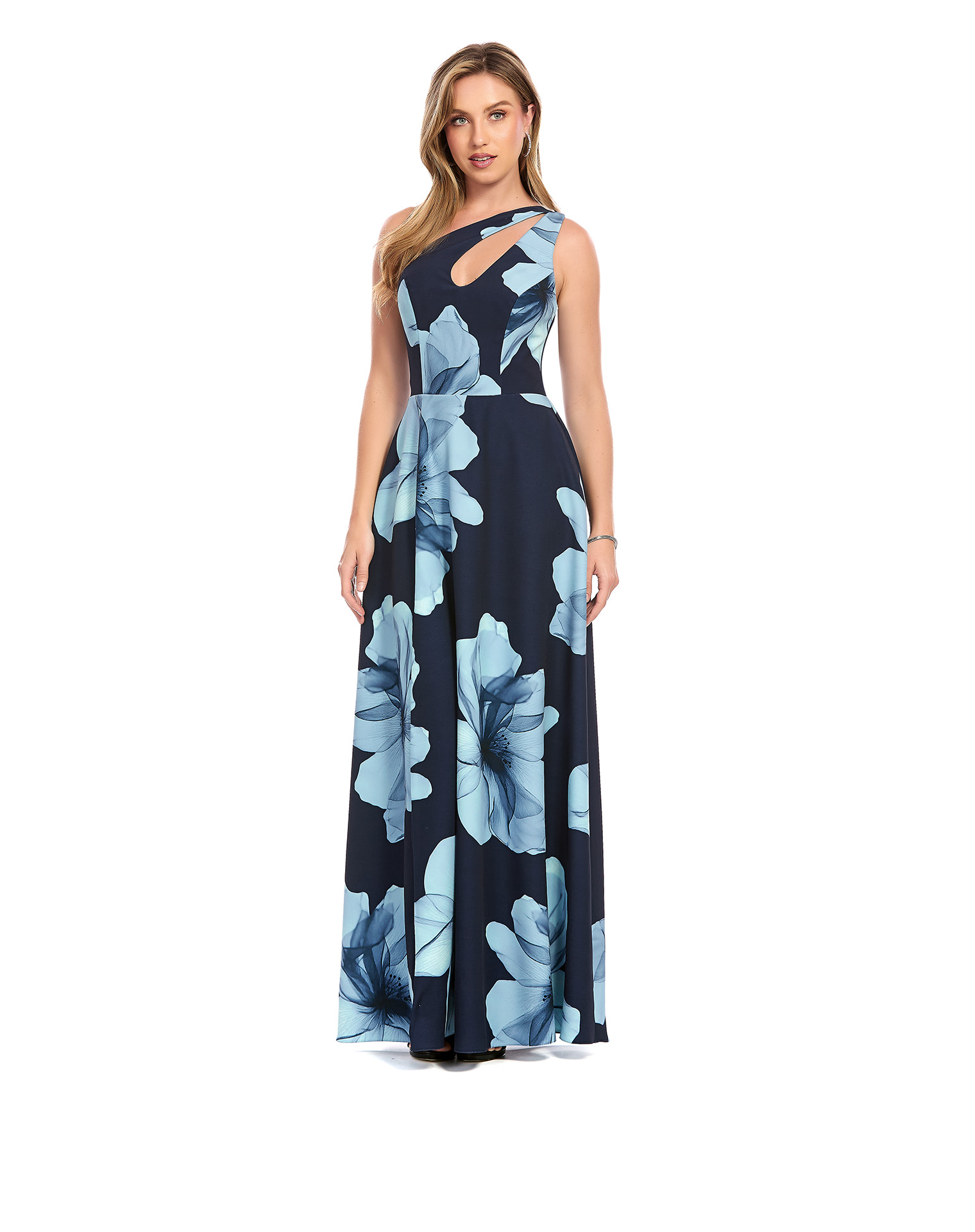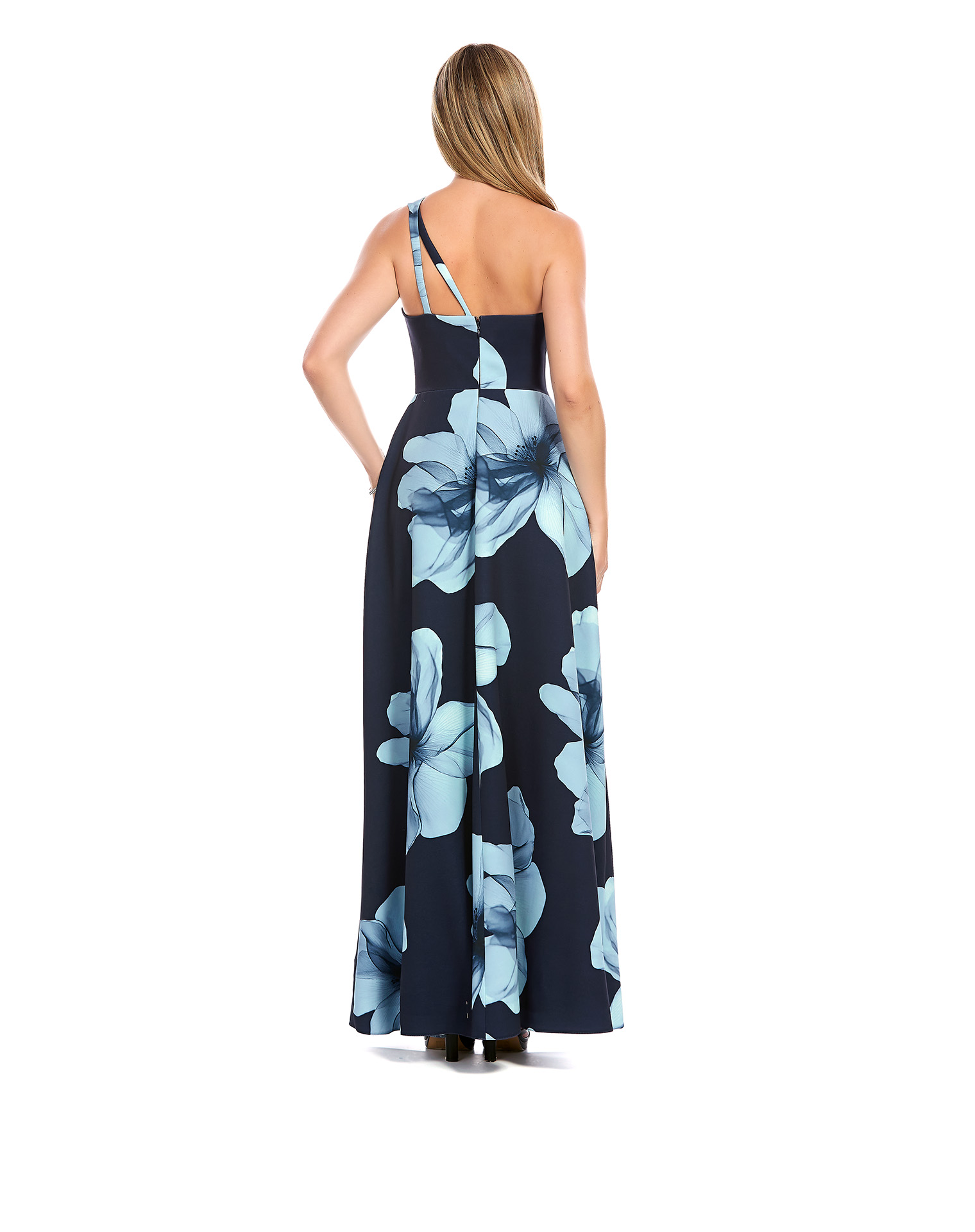 Vestido Largo Azul Escote Asimétrico Con Escote Ovalado Falta Semicircular Con Abertura
