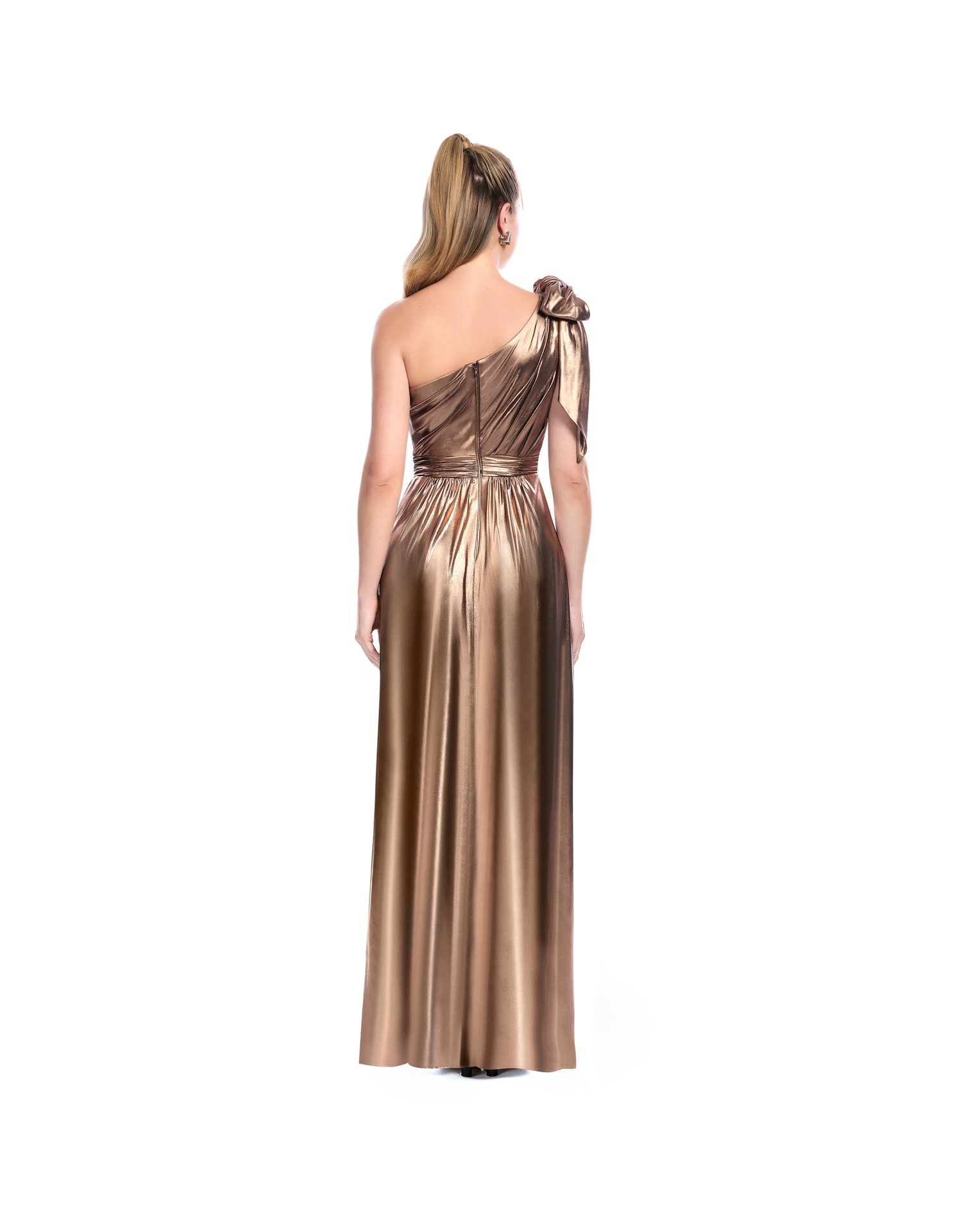 Vestido Largo Cafe Escote Asimétrico Con Talle Y Fajilla Drapeada Falda Semicircular