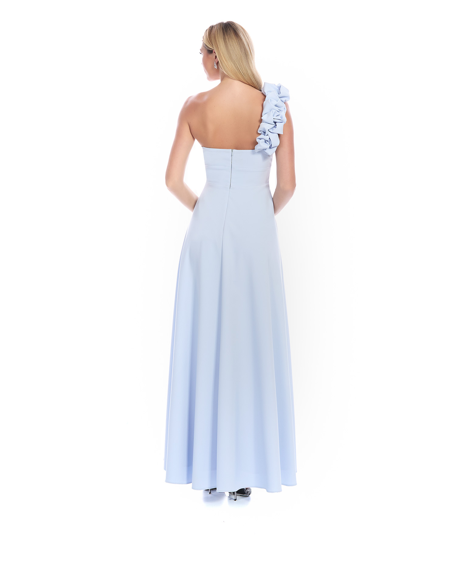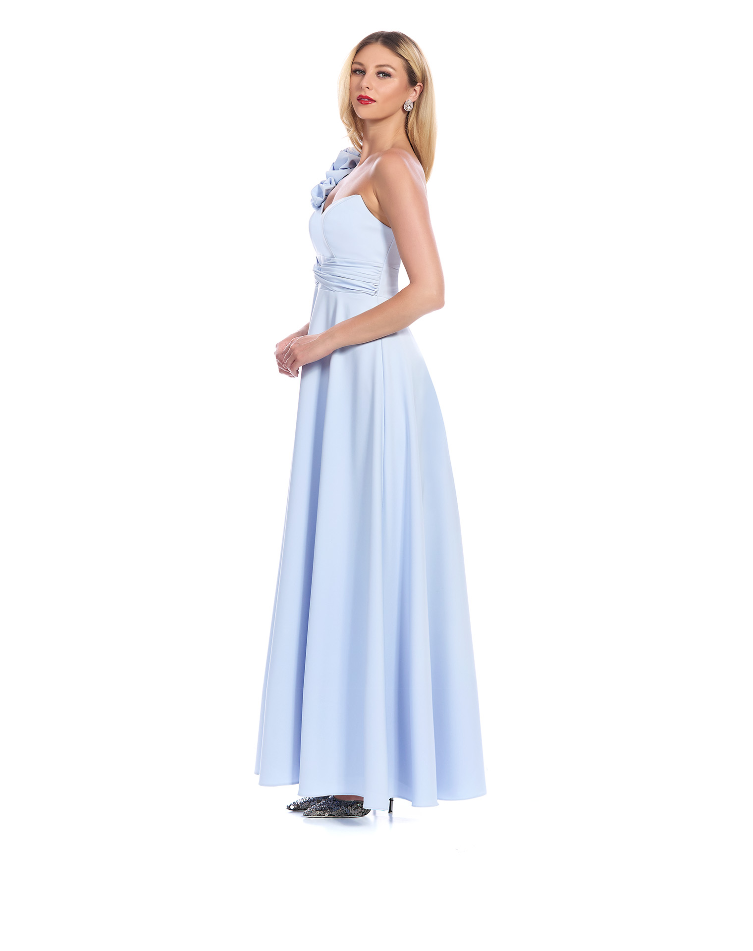 Vestido Largo Azul Escote Corazón Con Adorno En Hombro Con Amarre En Fajilla Y Falda Semicircular