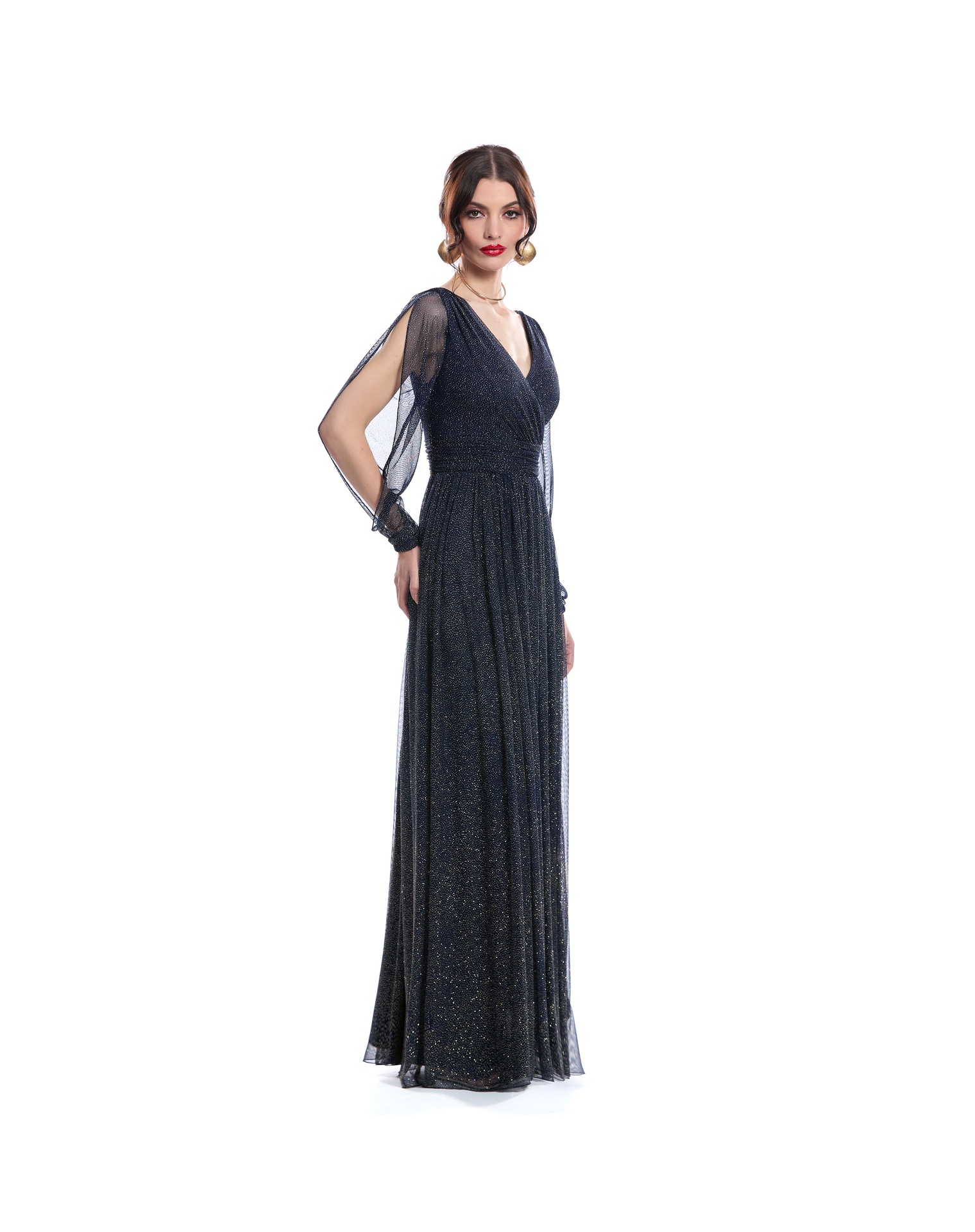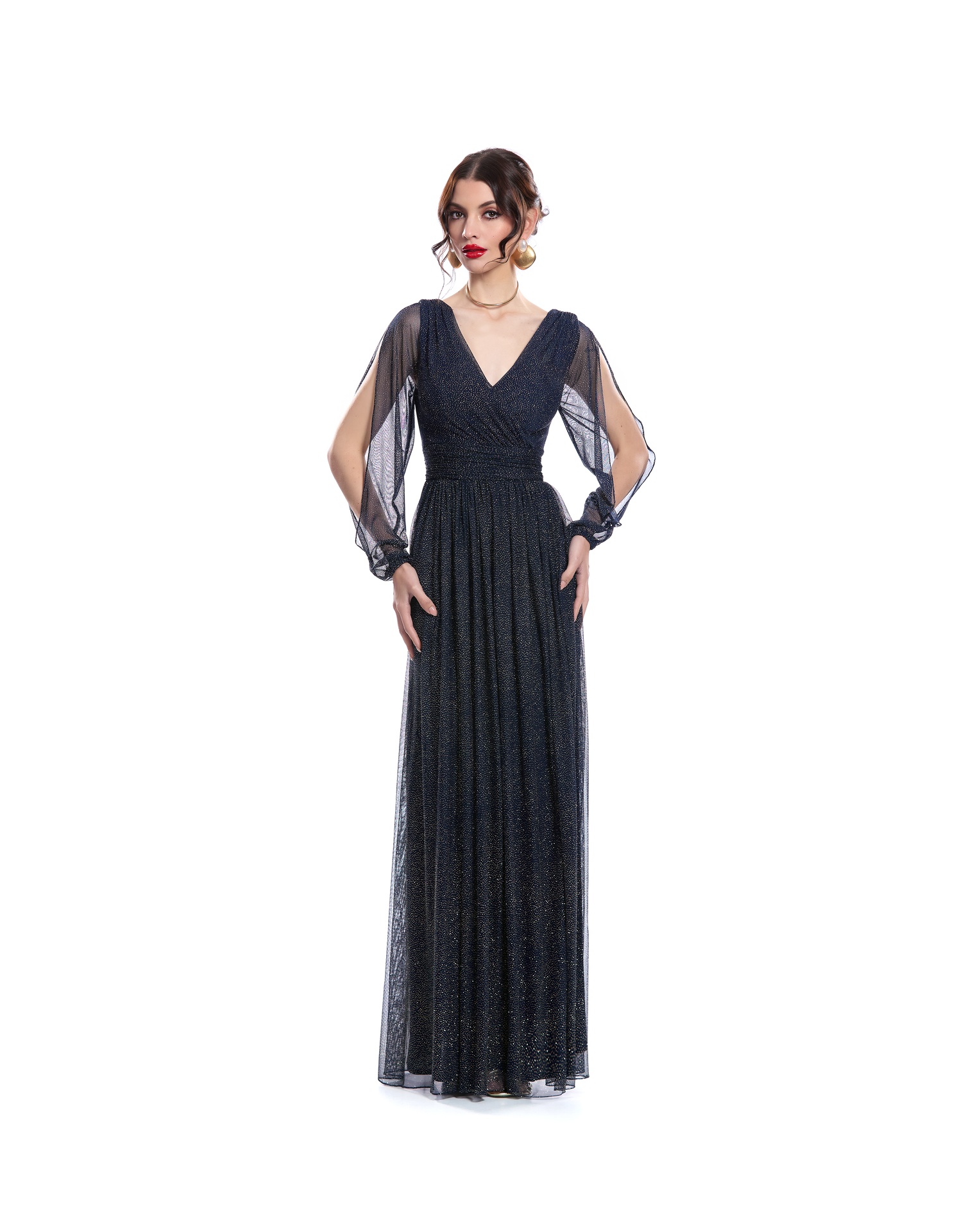 Vestido Largo Azul Escote En V Con Manga Larga Drapeado En Talle Y Fajilla Falda Semicircular Con Pliegues