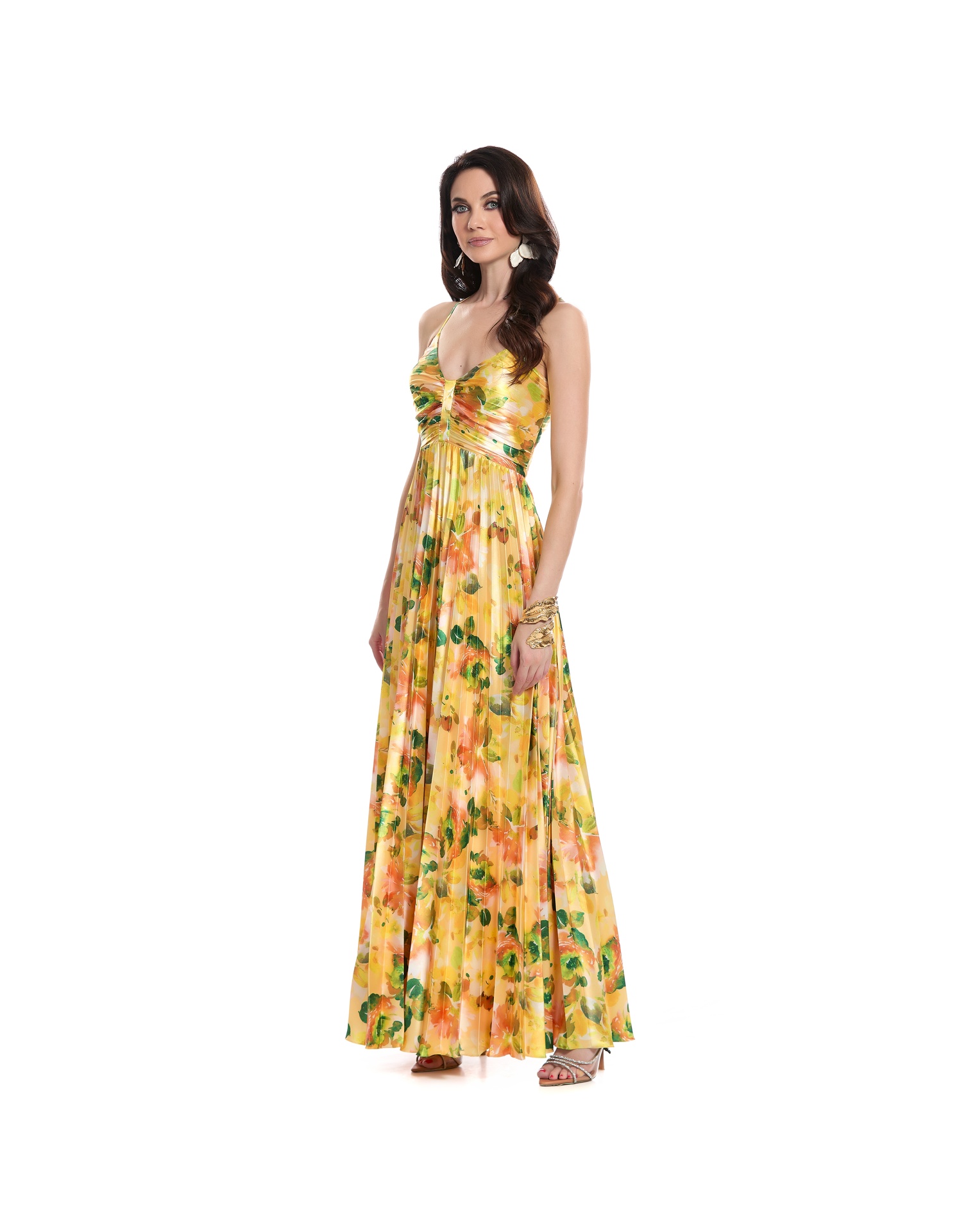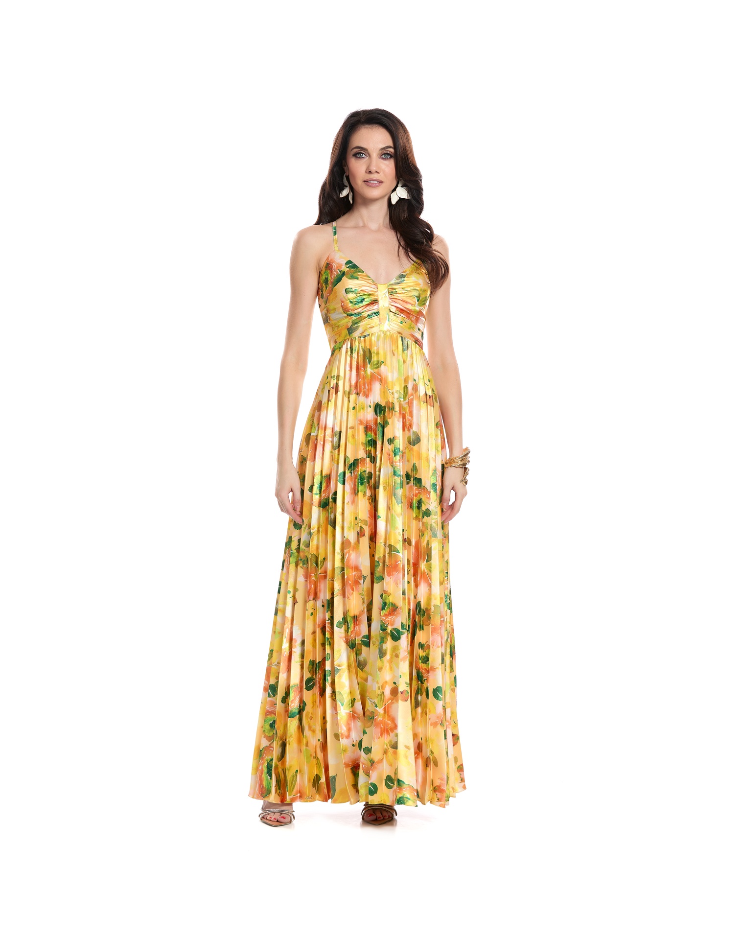 Vestido Largo Amarillo Escote V Con Tirantes Talle Cruzado Drapeado Falda Plisada
