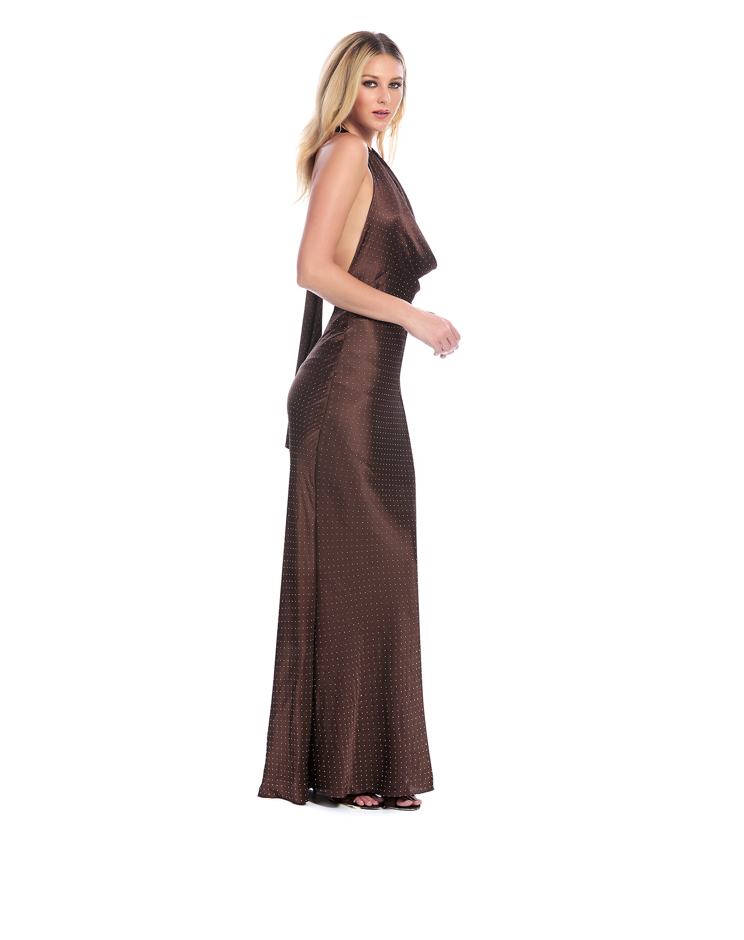 Vestido Largo Cafe Halter Escote Cascada Con Espalda Descubierta Falda Tipo Sirena Con Abertura