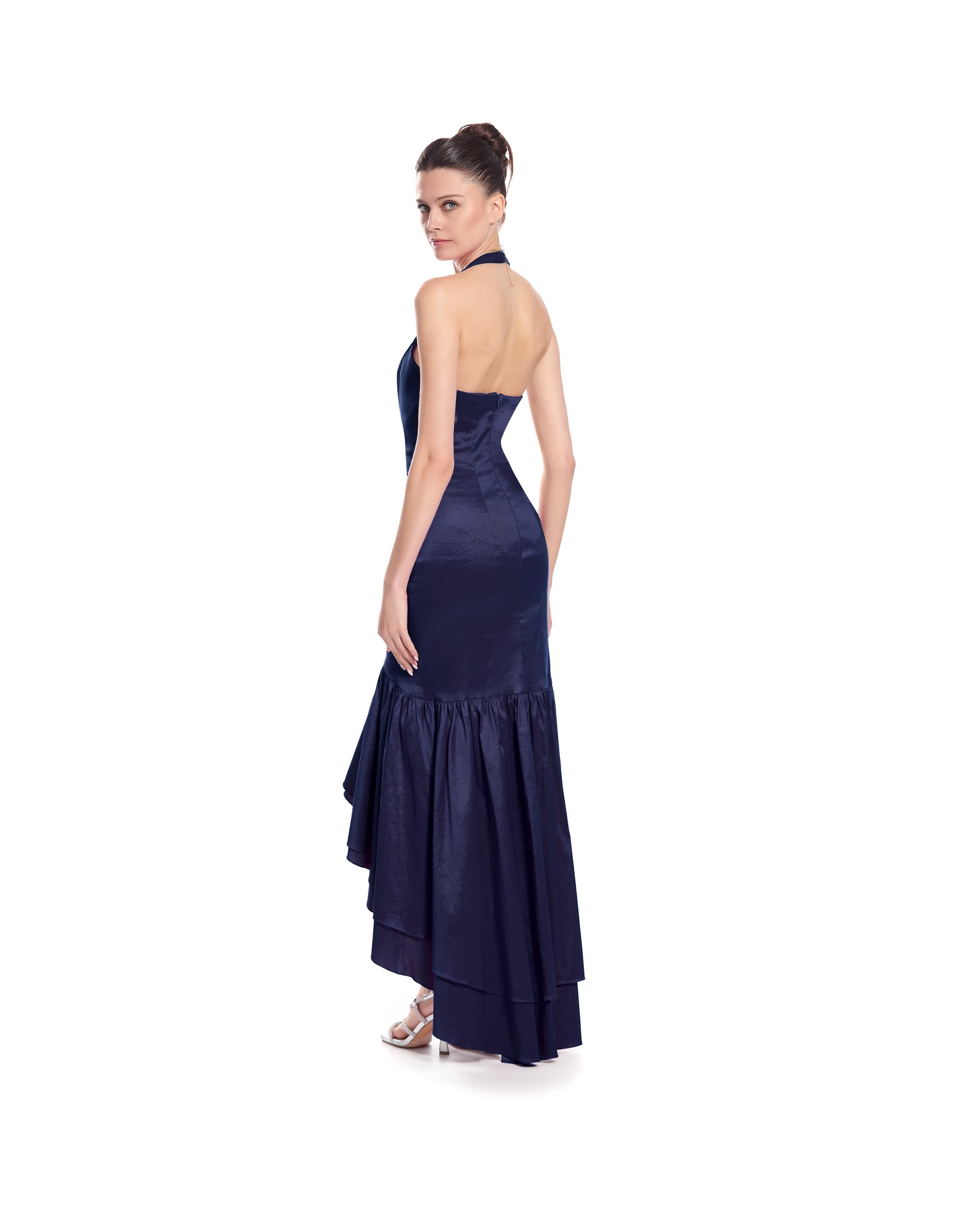 Vestido Largo Azul Halter Falda Tipo Sirena Asimétrica Con Olanes