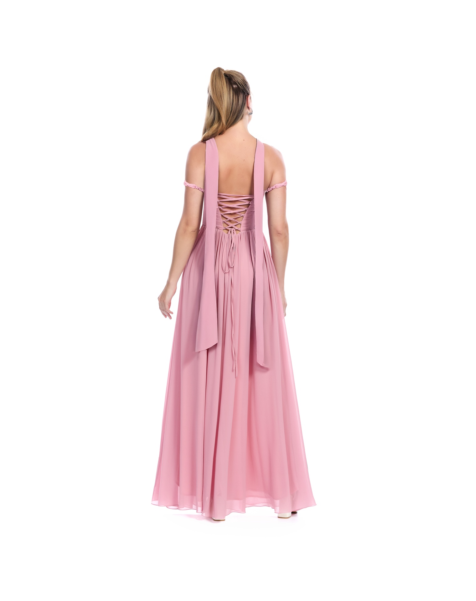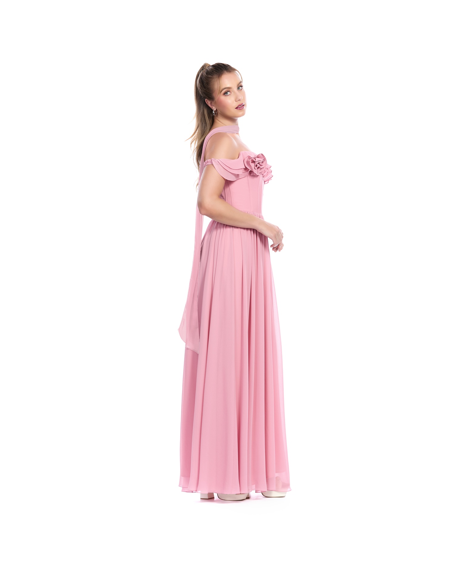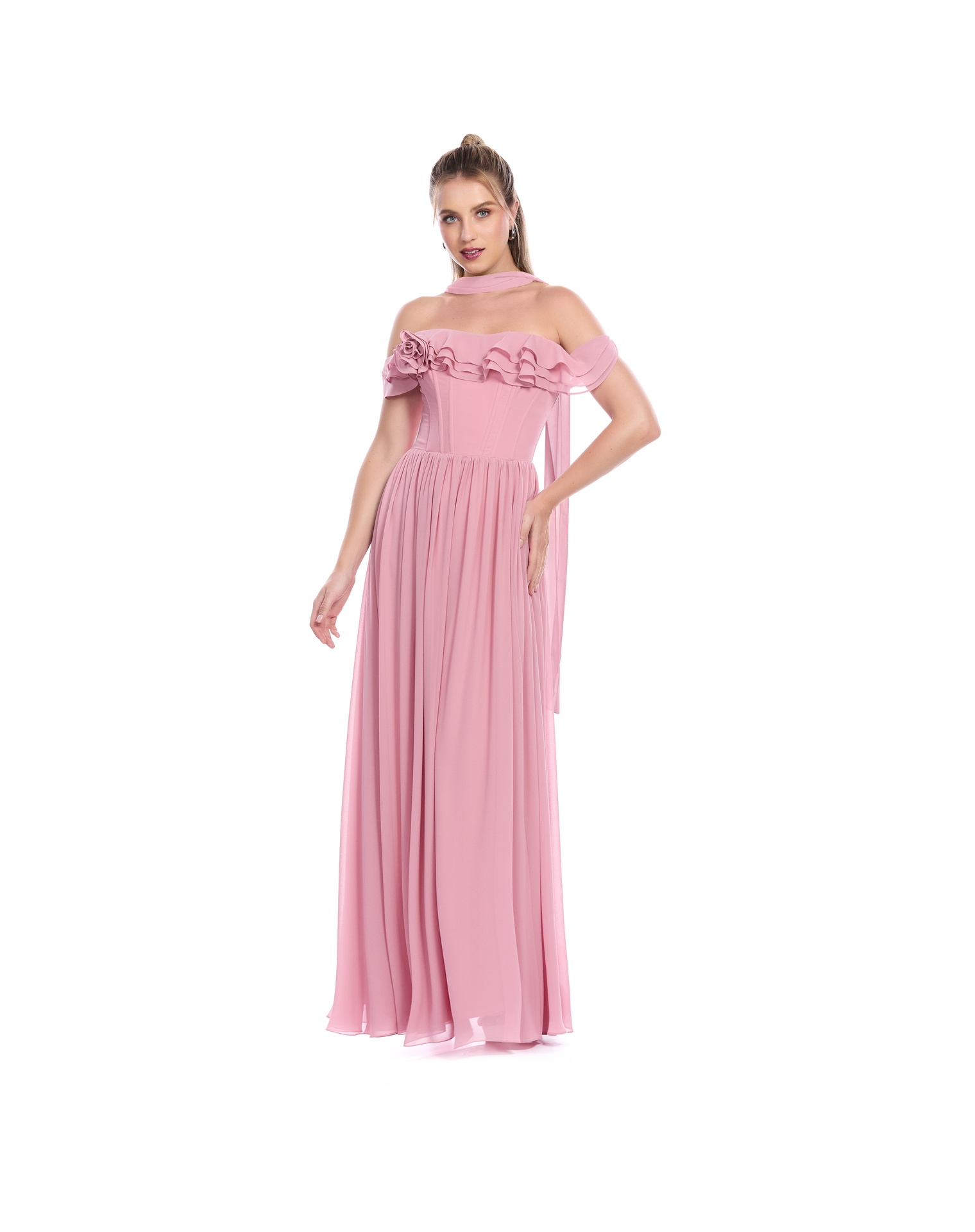 Vestido Largo Rosa Strapless Con Escarola En Escote Varillas En Talle Y Falda Semicircular