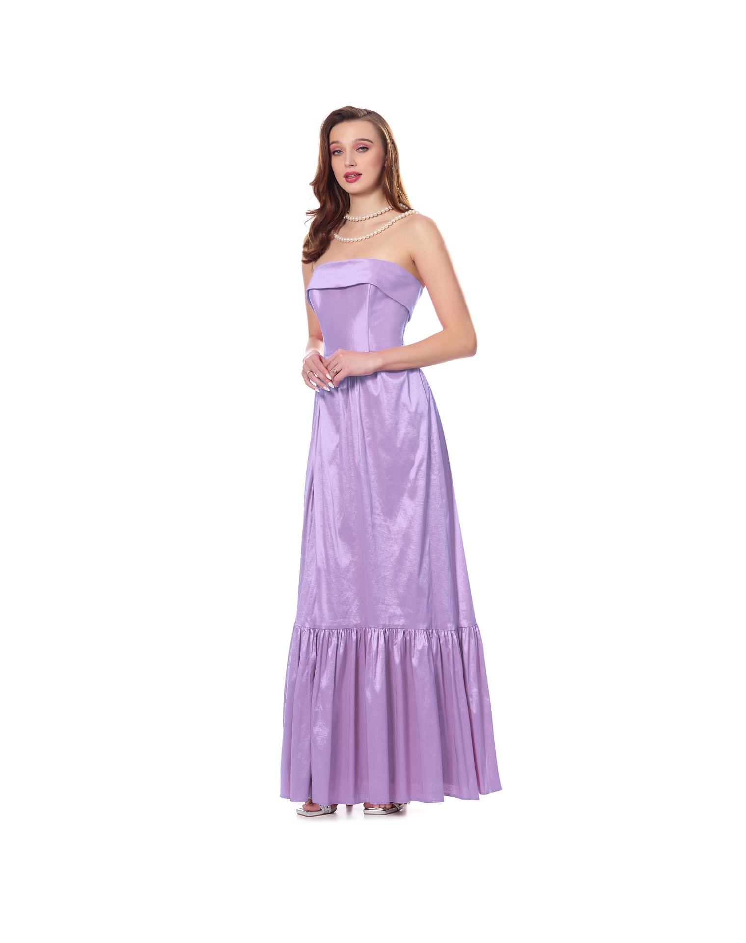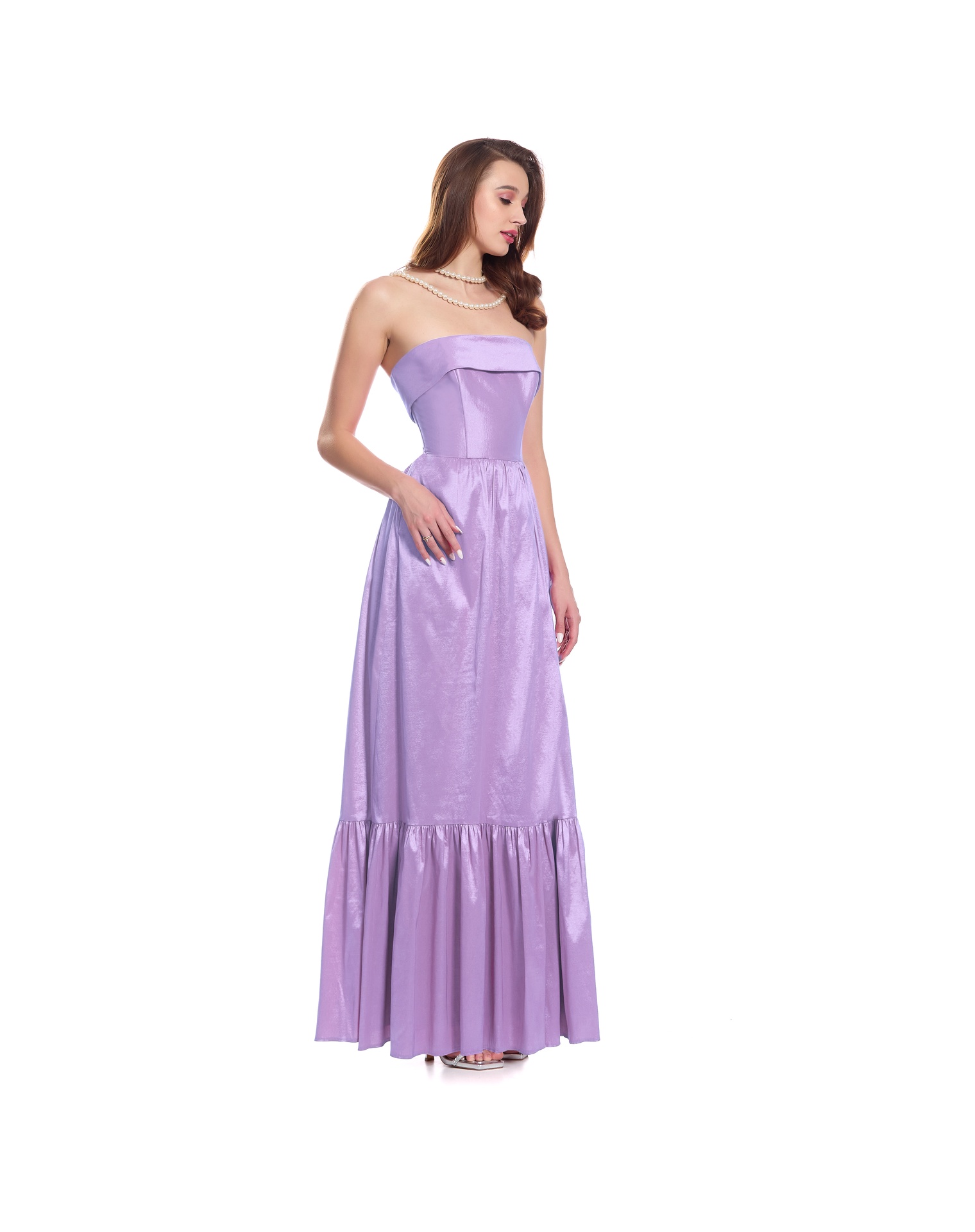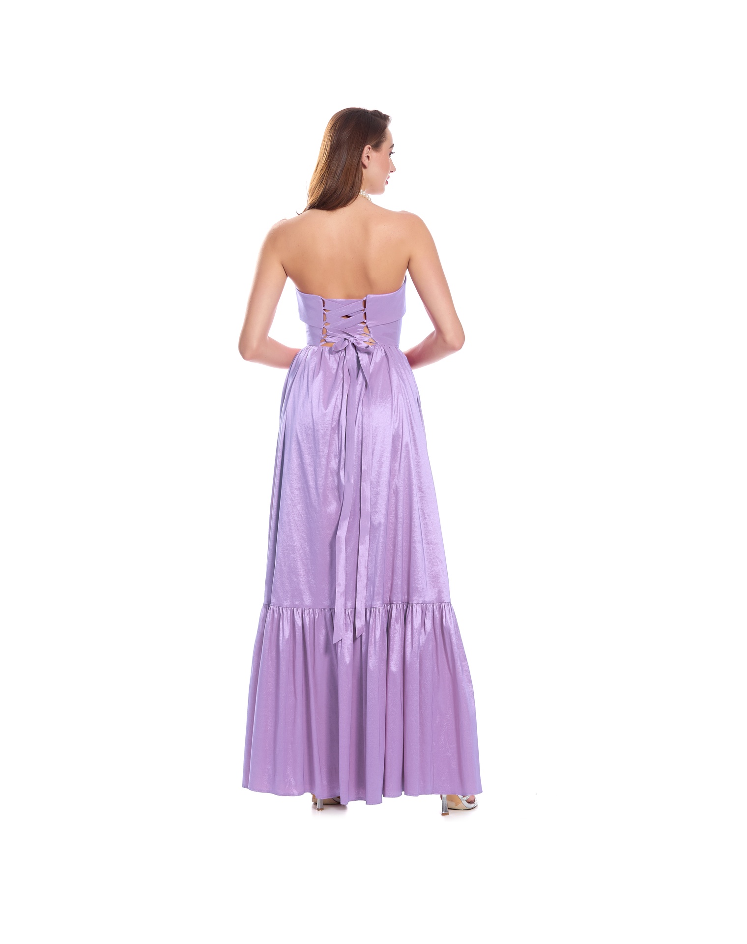 Vestido Largo Lila Strapless Con Jaretas En Espalda Falda Con Olán