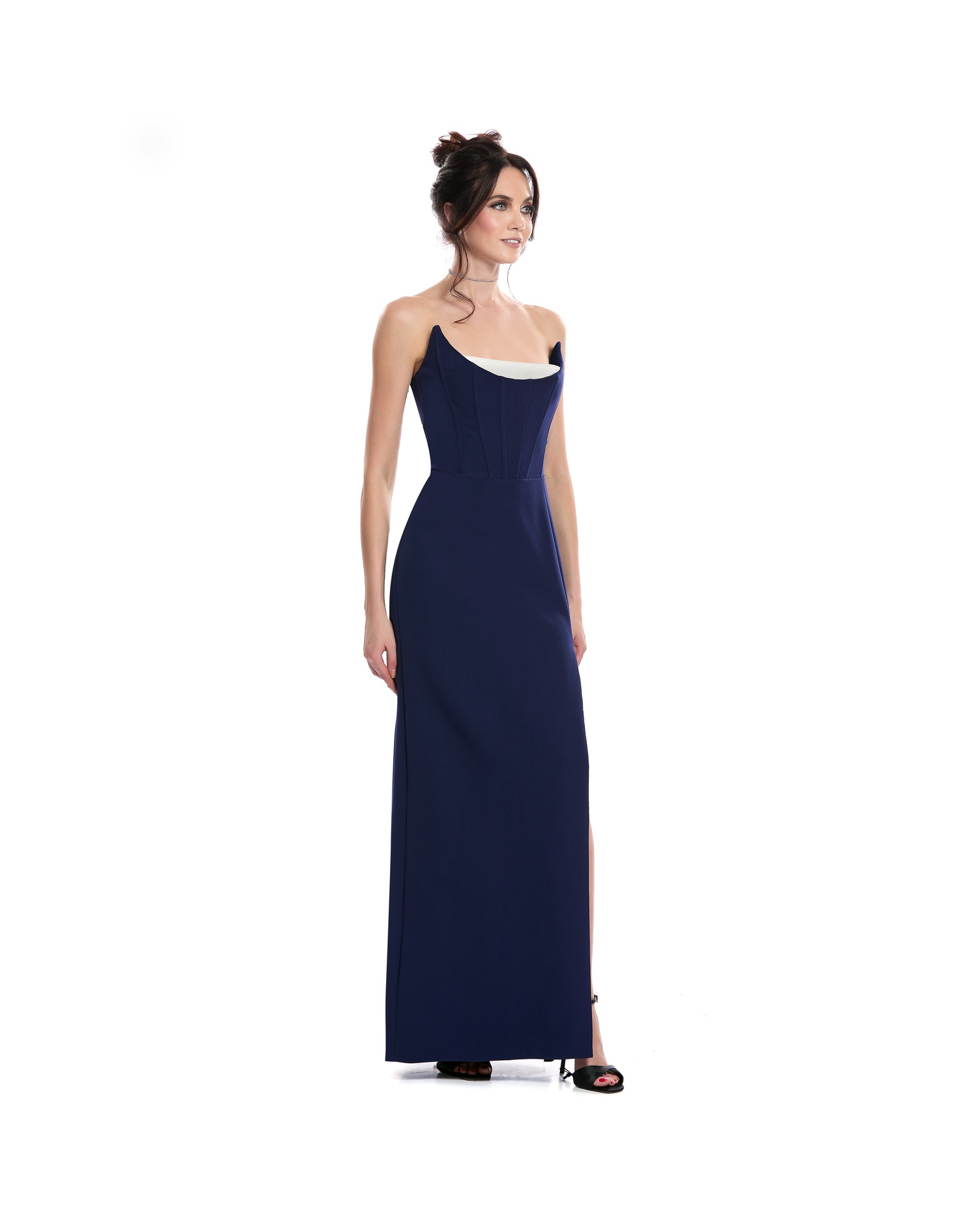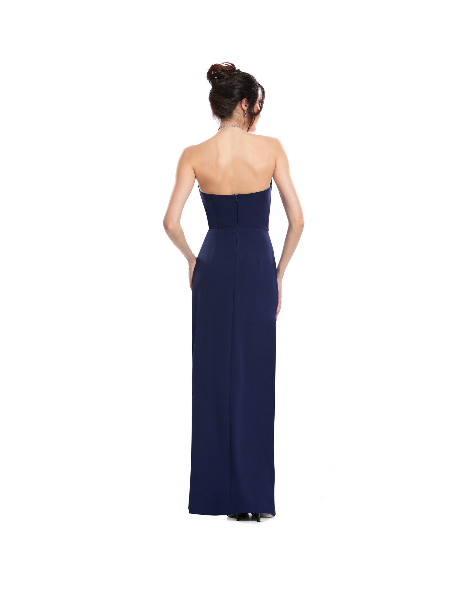 Vestido Largo Azul Strapless Talle En Picos Con Varillas Falda Recta Con Abertura